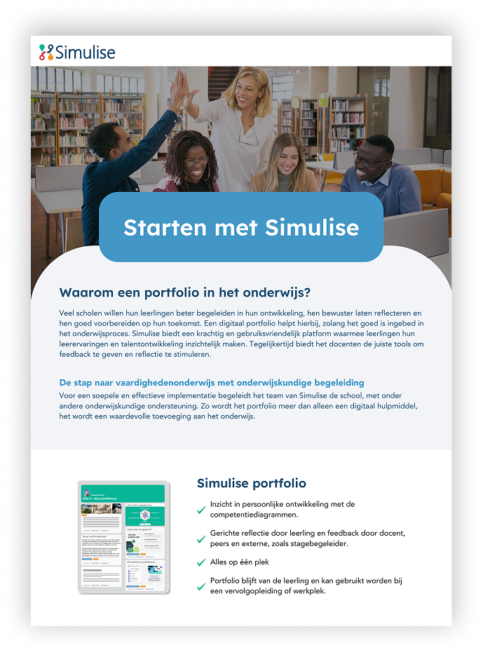 Simulise is een gebruiksvriendelijk digitaal portfolio dat studenten eigenaarschap geeft over hun leerproces. Studenten kunnen hun portfolio op een persoonlijke manier vormgeven.